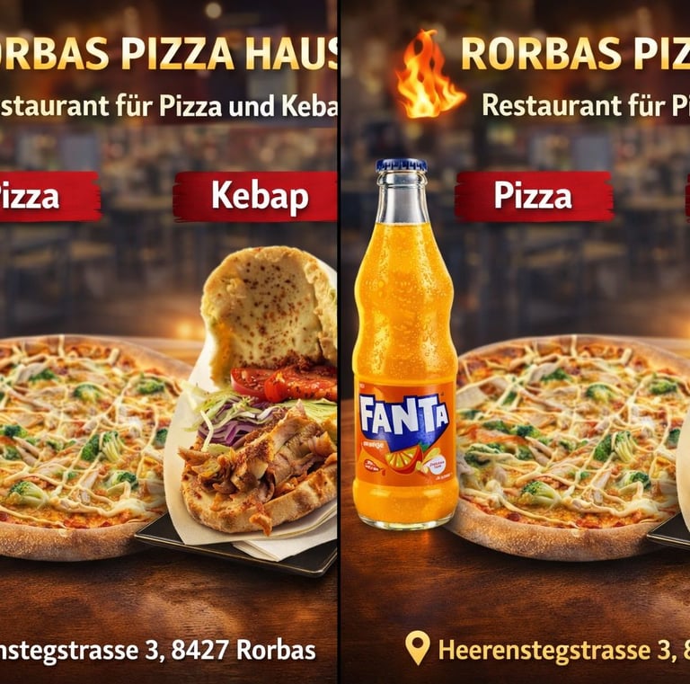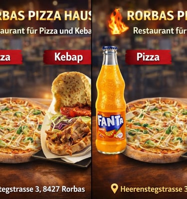 Unsere Gerichte und das gemütliche Ambiente im Rorbas Pizza Haus.